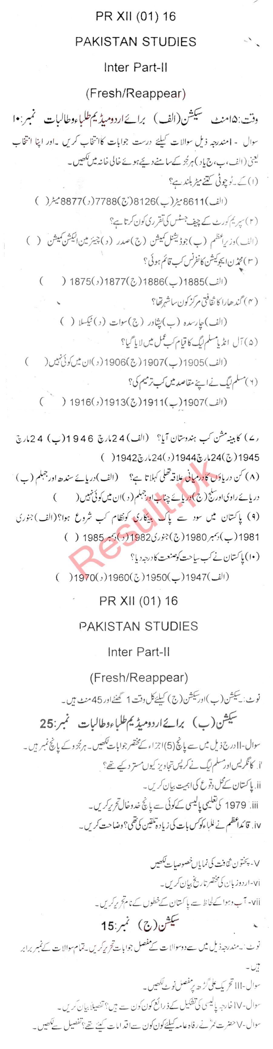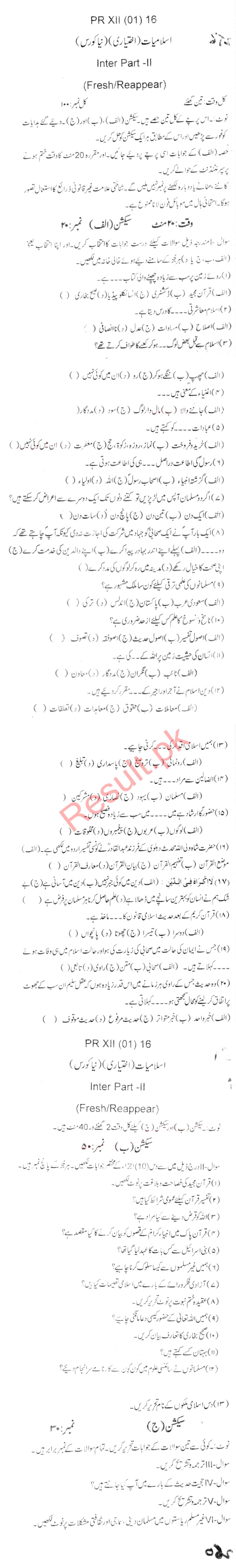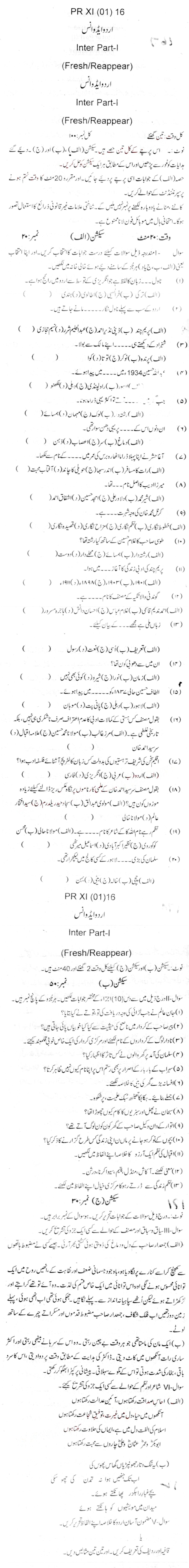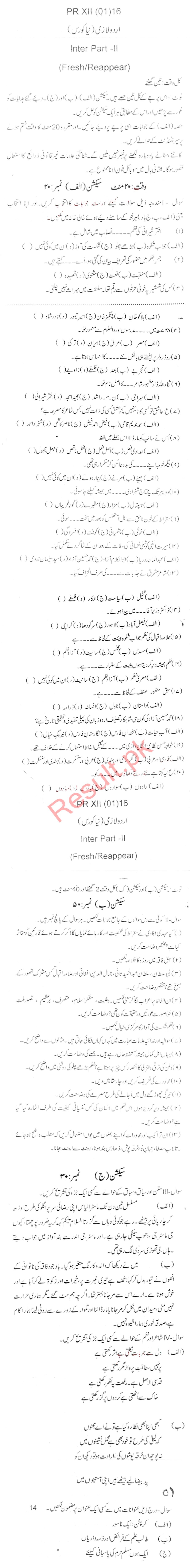 Bise Dikhan pastpaper 2016 12th class
